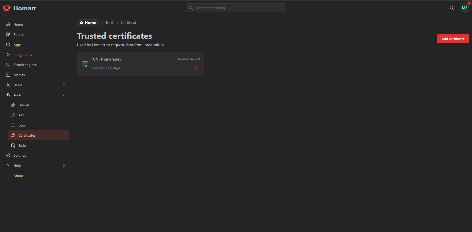 . To add the certificate, this file needs to be copied and uploaded to Homarr.